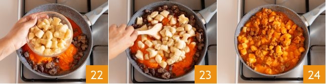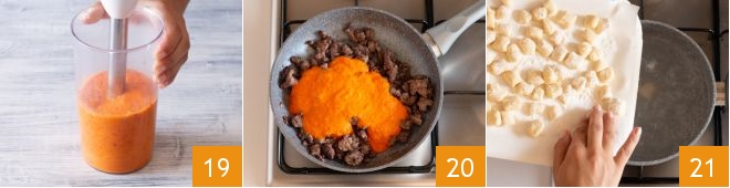 until you obtain a smooth cream 19 that you can pour into the pan with the sausage 20. Boil the gnocchi, cooking a few at a time 21; drain them as soon as they float to the surface.