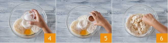 Also add the salt 4 and nutmeg 5. At this point, knead by hand 6