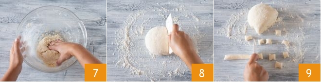 until you have thoroughly combined all the ingredients 7. Transfer the mixture to a work surface and work it until you get a compact and soft dough. Use a dough scraper to divide the dough into several portions and create many long strands, about 3/4 inch thick, then cut the strands into small pieces 9. Transfer them, one batch at a time, to a lightly floured tray.