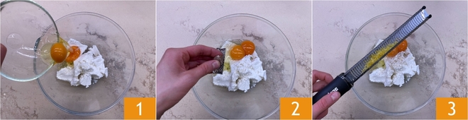 To prepare the ricotta gnudi with vegetable ragù, start with the gnudi dough: in a bowl, add well-drained sheep ricotta and eggs 1, then flavor with nutmeg and lemon zest 3.