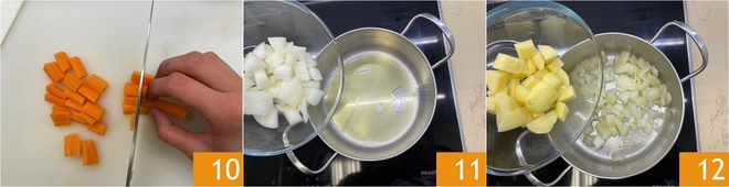Do the same with the carrot 10. In a pan, pour a drizzle of oil along with the onion 11. Sauté for a minute, then add the potato 12.