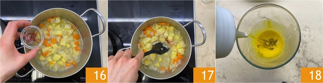 When the vegetables are cooked, turn off the heat and enhance with saffron threads 16, then mix well to release aroma and color 17. Transfer the vegetables to a jug and add a drizzle of oil 18.
