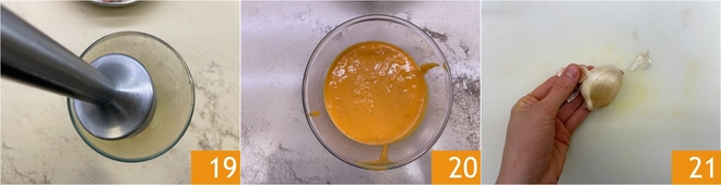 Blend with an immersion blender 19 to obtain a smooth and homogeneous sauce 20. Set the saffron sauce aside and focus on the vegetable ragù: clean the aglione 21.