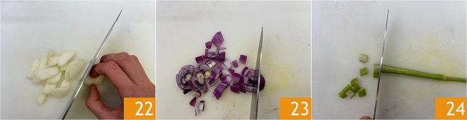 Cut it into slices about half a centimeter thick, it shouldn't be too thin 22. Clean and dice all the vegetables into about half-inch cubes: start with the red onion 23 and celery 34.