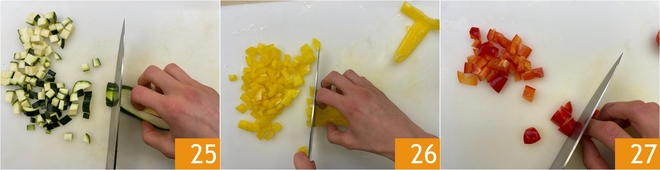 Continue with the zucchini 25, yellow peppers 26, and red peppers 27.