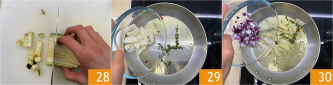 Finally, the eggplants 28. In a large pan, heat a drizzle of extra virgin olive oil with the aglione, a chopped chili pepper, and a sprig of thyme 29. Sauté for 3-4 minutes, then add the onion 30.