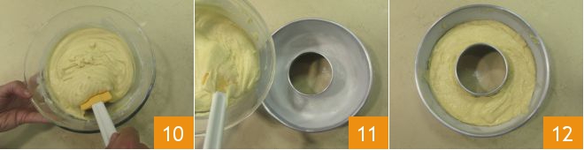 Continue mixing with the spatula to make the mixture homogeneous 10. Butter and flour a 8-inch ring mold, pour the batter here 11, tap the mold to distribute it evenly 12.