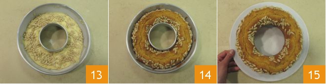 Distribute the pine nuts on top 13 and bake the cake in a preheated static oven at 356°F for about 35 minutes. Once cooked, remove the ricotta ring cake with honey and pine nuts from the oven 14, let it cool slightly before unmolding and serving it 15.