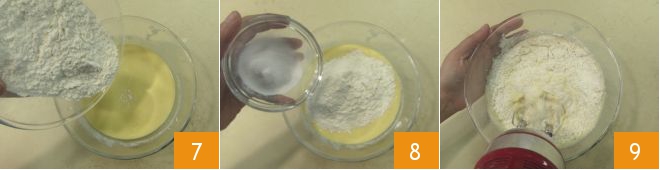 At this point, incorporate the sifted flour 7 and baking powder 8, using the electric beaters for a few more seconds 9.