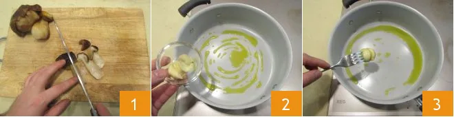 To prepare rigatoni with porcini and berries, first start by gently washing the porcini mushrooms (for more details on cleaning porcini mushrooms click How to Clean Porcini Mushrooms). Place the washed porcini mushrooms on a cutting board and slice them 1. Now take a non-stick pan, drizzle with a bit of oil, and brown a clove of garlic 2. When the garlic is golden, remove it from the heat 3.
