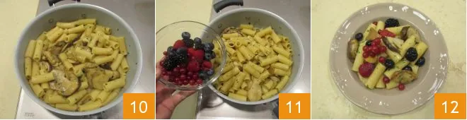 Pour the al dente rigatoni into the pan where you cooked the mushrooms and mix the ingredients to combine them uniformly 10. If the sauce is too dry, add a bit of pasta cooking water. A few minutes before removing the pan from the heat, add the berries 11, leaving some aside for decoration, and blend them into the pasta very gently so they remain as whole as possible. Then serve the rigatoni with porcini mushrooms and berries, decorating them with a handful of fresh berries, and enjoy the compliments of your guests 12!
