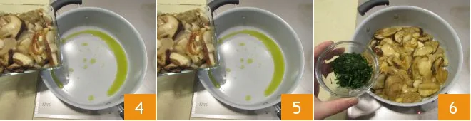 Then add the previously washed and sliced porcini mushrooms to the pan 4 and cook them over medium-high heat for 6 minutes. Then take the parsley, rinse it, place it on a cutting board, and finely chop it 5. Add the parsley to the mushrooms that are cooking 6. Adjust with salt and pepper. Use a wooden spoon to mix the ingredients well. Then turn off the heat.
