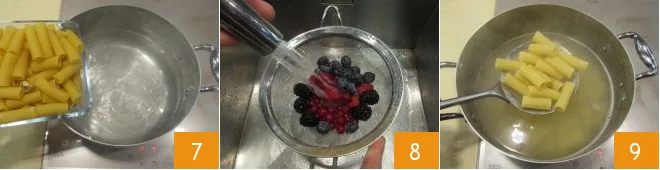 At this point, take a pot and fill it with water. Heat it up, and when the water is boiling, add salt. Then pour in the rigatoni 7. While the rigatoni is cooking, rinse your mixed berries thoroughly in water 8. When the rigatoni is al dente, drain them using a slotted spoon, so as not to discard the pasta cooking water 9.