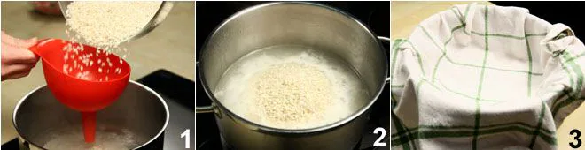When the water resumes boiling, cook the rice for 10-12 minutes over high heat without a lid, occasionally shaking the pot to jostle the rice and level it. After 10-12 minutes, the rice should have absorbed all the water; remove it from the heat and cover the pot with a cloth that should be in contact with the rice 3,