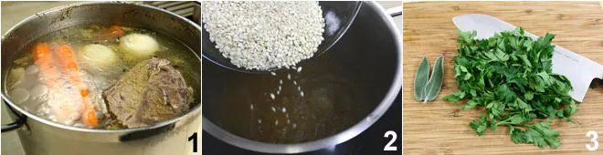 To prepare rice and parsley, start with making a good meat broth 1 Beef Broth Then bring it to a boil in a large pot and add the rice 2. Cook the rice for about 15 minutes, in the meantime clean two sage leaves and a bunch of parsley 3