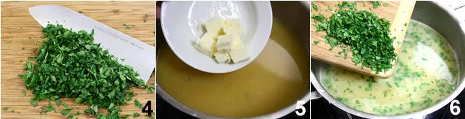 and chop them coarsely with a knife. After the rice has cooked for the necessary time, adjust the salt if needed, turn off the heat and add the butter 5 and the chopped parsley and sage 6. Mix well and serve the rice and parsley piping hot, sprinkling each plate with plenty of grated Grana cheese.