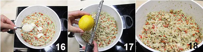 As soon as the rice has reached the desired cooking, turn off the heat; cream with butter, Parmigiano Reggiano 16, and the zest of half a lemon 17. Your risotto with clams is ready, serve it and enjoy immediately 18.