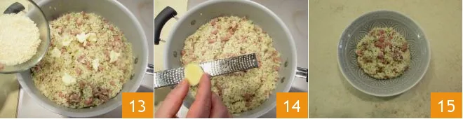 and with the grated cheese 13, then add the freshly grated ginger 14. Plate the beer and mortadella risotto and serve it very hot 15!