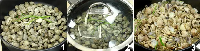 To prepare the carrot, ginger, and clam risotto, first prepare the ginger oil by lightly heating two tablespoons of extra virgin olive oil with 10 grams (0.35 oz) of cleaned and thinly sliced ginger. Let it sit for a day before straining it. Then, open the clams. Pour them into a pan (after they have been well purged) with a clove of garlic and a parsley stem without leaves 1, cover the pan with a lid 2 until the clams open 3.