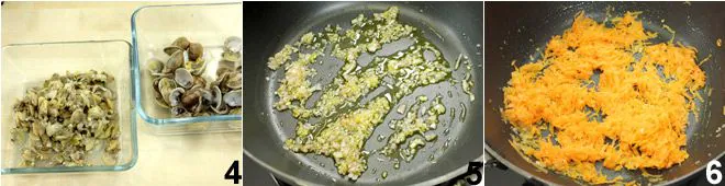 Then shell the clams, keeping some with the shell 4 for the final decoration and strain their water. Finely chop the shallot, gently sauté it 5 with a drizzle of ginger oil and add the carrots 6.