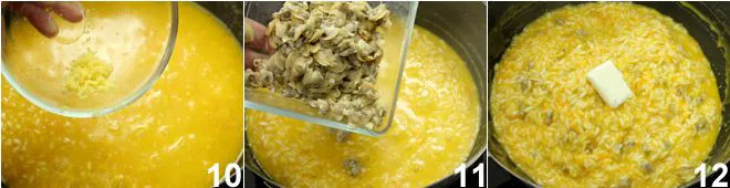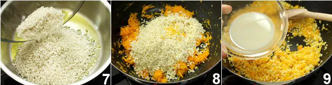 Toast the rice in a separate pot 7, and when it's ready, add it to the carrots 8, moistening everything as needed with the vegetable broth 9 mixed with the clam water, salt, and pepper.