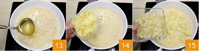 Moisten with a couple of ladles of broth 13, adding it whenever the rice dries out. Halfway through cooking, add 3.5 oz of Tête de Moine 14 and the seared pears with their cooking liquid 15, season with salt, and mix well.