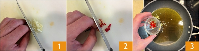To prepare the risotto-style garlic, oil, and chili spaghetti, first bring a pot of salted water to a boil to cook the pasta. Meanwhile, chop the garlic 1 and chili pepper into pieces 2, then finely chop the parsley. Pour the oil, garlic, and chili pepper into a large pan 3.