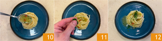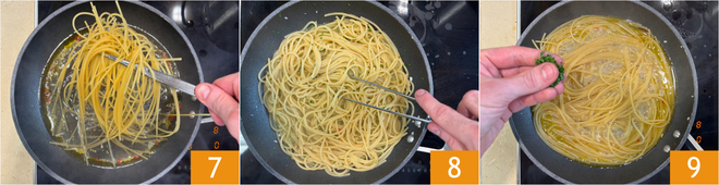 Drain the spaghetti directly into the pan 7 and finish cooking them, adding more cooking water as needed and stirring often as if it were a risotto 8. Finally, season with the chopped parsley 9.