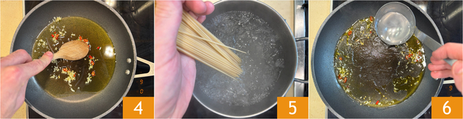 Sauté over low heat for a couple of minutes, being very careful not to burn the garlic 4. When the water reaches a boil, cook the spaghetti for half the time indicated on the package 5. In the meantime, add a ladle of pasta cooking water to the sauté 6.