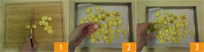 To prepare the risotto, wash, dry, and cut the new potatoes into slices about 0.08 inches 1, place them on a baking sheet lined with parchment paper, and season them with salt 2 and oil 3. Bake them in a preheated oven at 392°F for 30 minutes.