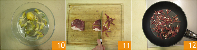 Keep them in a bowl with water and lemon juice to prevent them from darkening 10. Meanwhile, cut the prosciutto into strips 11, and place it in a very hot pan 12.