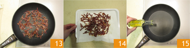 Brown it well over high heat. When it is crispy 13, place it on a plate with absorbent paper 14 and set it aside. Heat a drizzle of oil in the same pan 15
