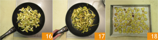 add the artichokes 16 and cook them over high heat (it will take about 6-7 minutes) and salt them. When they are well colored 17, turn off the heat and set them aside. Meanwhile, the potatoes will have cooked, remove them from the oven 18 and keep them at room temperature.
