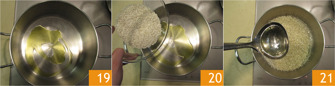 Start cooking the risotto. In a saucepan, heat a drizzle of oil 19, add the rice 20, and toast it for a few minutes. Deglaze with a ladle of vegetable broth 21