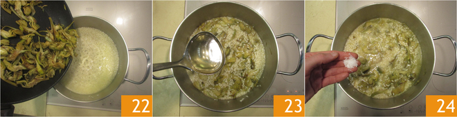 Add ¾ of the artichokes, keeping the rest for serving. Continue cooking the rice for about 15 minutes, stirring occasionally and adding a ladle of broth each time the rice starts to dry out 23, salt to taste 34.