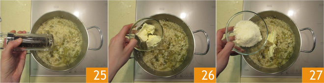 When cooking is complete, turn off the heat and adjust the seasoning with salt and pepper 25. Cream with butter 26, Parmesan 27, and stir.