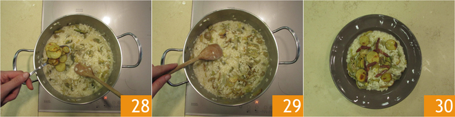 Finish by adding the roasted potatoes 28 and gently mix 29. Plate your rice and top with some artichoke wedges, potato slices, and crispy prosciutto. Your risotto with artichokes and potatoes is ready to be served hot!