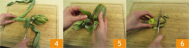 Meanwhile, clean the artichokes: cut off part of the stem 4, remove the outermost leaves 5, and the tip 6.