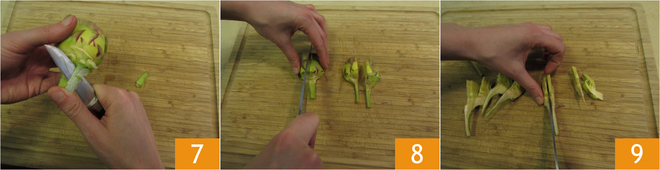 With a small knife, peel the remaining stem to remove the tougher outer part 7. Cut the artichokes into quarters 8 and then each into 16 wedges 9.
