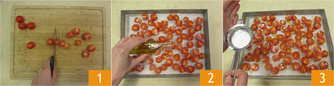 To make the risotto with baby spinach pesto, start with the cherry tomatoes: after washing them, cut them in half 1 and place them on a baking tray, season them with oil 2, salt, powdered sugar 3,