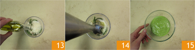oil 13, pepper in a tall and narrow container and blend everything with a hand blender 14. When the pesto is smooth, it will be ready; set it aside 15.