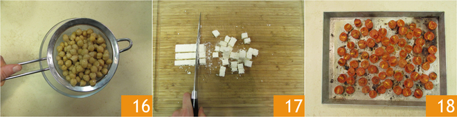Drain the chickpeas 16 and cut the quartirolo cheese into approximately 1/2-inch (1.3cm) cubes 17. Meanwhile, your cherry tomatoes will be cooked; take them out of the oven 18.