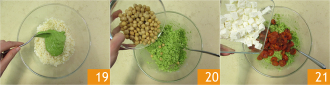 It's time to dress the rice. Put it in a large bowl and add the baby spinach pesto 19, give it a good stir, and if necessary, add a drizzle of oil. Add the chickpeas 20, confit cherry tomatoes, and quartirolo cheese 21