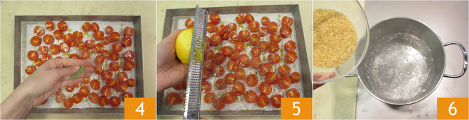 oregano 4 and grated lemon zest 5. Bake in a preheated static oven at 392°F (200°C) for 30 minutes. In the meantime, boil the rice in salted water 6 for 10 minutes or as indicated on the package.