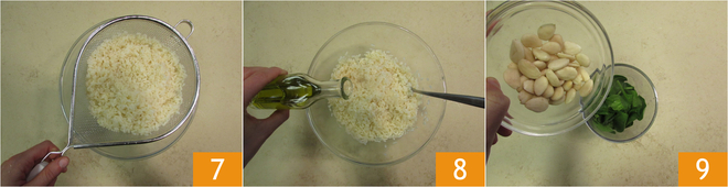 Drain the rice 7 and set it aside in a bowl with a drizzle of oil to prevent it from sticking 8. Now focus on the pesto. Put the baby spinach, almonds 9,
