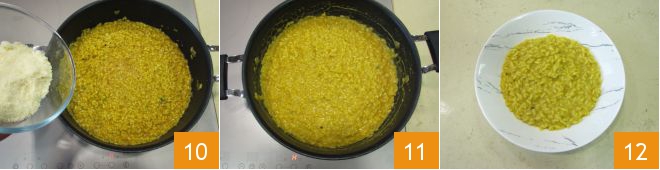 Stir in the grated Grana Padano PDO 10 and let it rest for a moment. The beer, saffron, and Grana Padano risotto is ready 11, enjoy it hot 12.