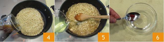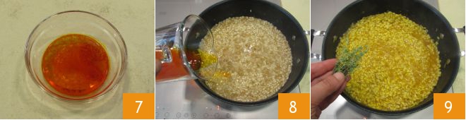 Deglaze with the beer 4 and let it evaporate. Stir and pour a little broth at a time 5, waiting for the liquid to be absorbed before adding more. Toward the end of cooking, dissolve the saffron powder in a small bowl with a bit of hot water 6.