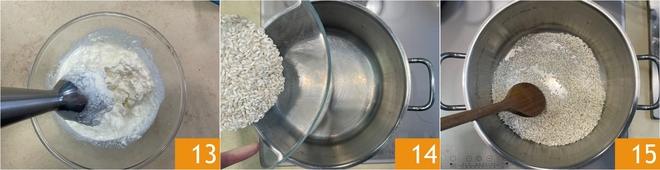 You don't need to blend it for long, just until it becomes creamy 13. Place a pot full of water on the heat and bring it to a boil; it will be used to cook the rice. Pour the rice into another pot 14 and toast it over medium heat 15.