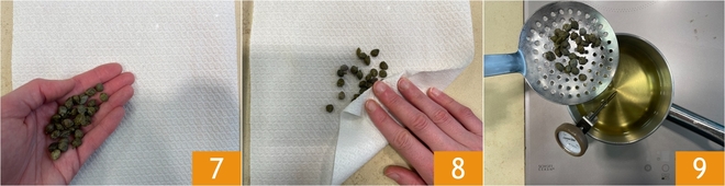 Meanwhile, desalt the capers by rinsing them under water, then place them on a sheet of kitchen paper 7 and dry them well by pressing with the paper to remove all the water 8. Fry the capers in hot oil at 320°F, using a slotted spoon to immerse them 9.