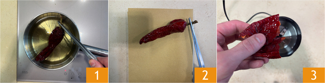 To prepare the risotto with butter, anchovies, and crunchy peppers, start with the latter. Bring the seed oil to 355°F, immerse the peppers and fry them for a few seconds 1. Drain them well on straw paper 2 and once dry put them in the mixer 3